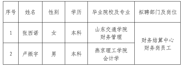 依據(jù)出資人代表機(jī)構(gòu)審批意見(jiàn),承德市國(guó)控投資集團(tuán)有限責(zé)任公司委托第三方機(jī)構(gòu)面向社會(huì)公開(kāi)招聘財(cái)務(wù)崗員工2人。現(xiàn)對(duì)擬錄用人員信息進(jìn)行公示,公示期間如有異議,可通過(guò)電話、信函等方式反映,反映意見(jiàn)請(qǐng)署真實(shí)姓名。
