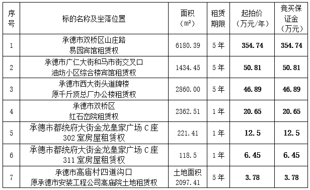 我集團全資子公司承德市國控資產(chǎn)運營有限公司、承德市國瑞物業(yè)管理有限公司委托河北福成拍賣有限公司,定于2020年1月21日上午9時在承德市雙橋區(qū)武烈路6號紫御國際假日酒店會議室公開拍賣下列標(biāo)的,現(xiàn)將有關(guān)事項公告如下: